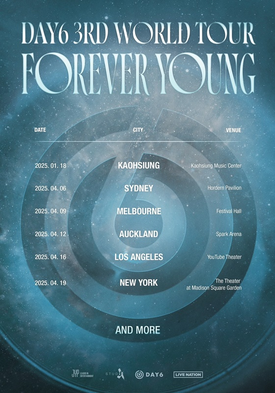 이에 따르면 데이식스는 2025년 1월 18일(이하 현지시간) 가오슝의 가오슝 뮤직 센터, 4월 6일 시드니 호던 파빌리온, 9일 멜버른 페스티벌 홀, 12일 뉴질랜드 오클랜드 스파크 아레나, 16일 로스앤젤레스 유튜브 시어터, 19일 뉴욕 더 시어터 앳 매디슨 스퀘어 가든까지 총 6개 지역의 공연장에서 단독 콘서트를 열고 투어 규모를 확장한다. 특히 뉴질랜드 오클랜드에서는 처음 DAY6 단독 공연을 펼치는 것으로 관심이 모인다. 여기에 'AND MORE'라는 문구가 더해져 더 많은 지역을 찾을 것을 예고해 팬들의 만족도를 높였다.